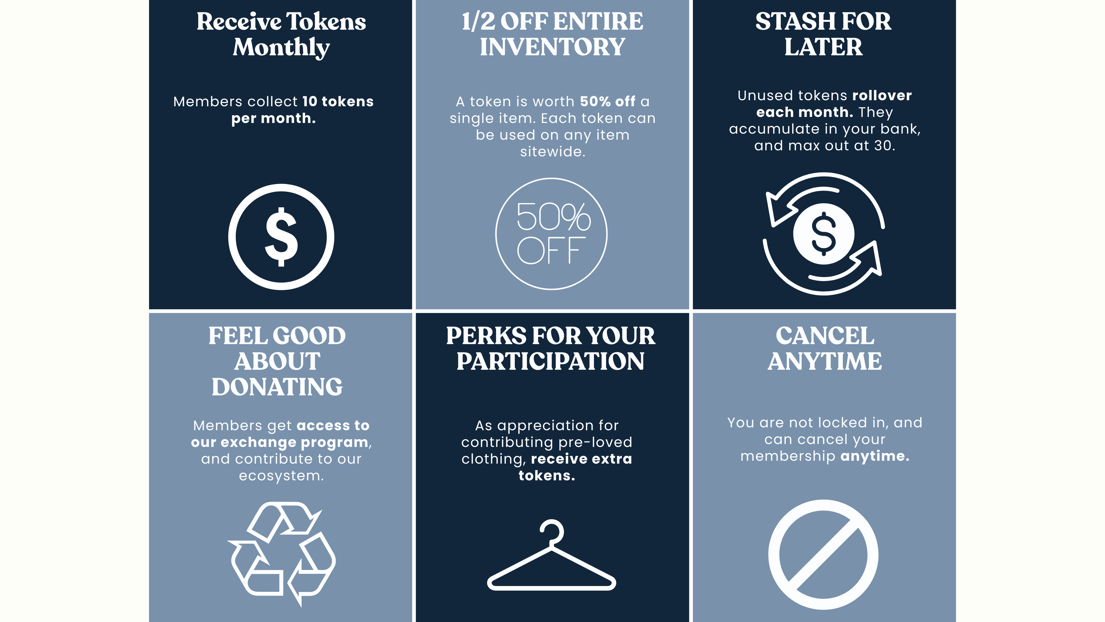 We are built on member contributations to help keep quality clothing in circulation. Our member program is designed to give back for your participation. We offer members a unique buying experience with our token credit system and exchange program.